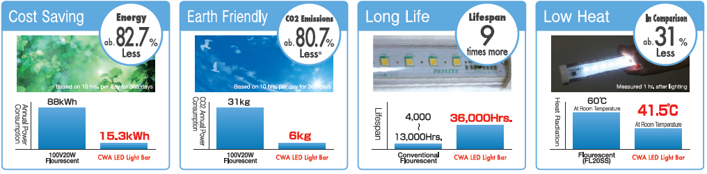 Vysoko spoľahlivý LED čip, ktorý je jadrom LED osvetlenia, má takmer 10 násobnú (okolo 40,000 hodín) svietivosť (založenú na jase LEDky 70%), v porovnaní s bežnými žiarivkami. Taktiež neobsahuje žiadnu ortuť.